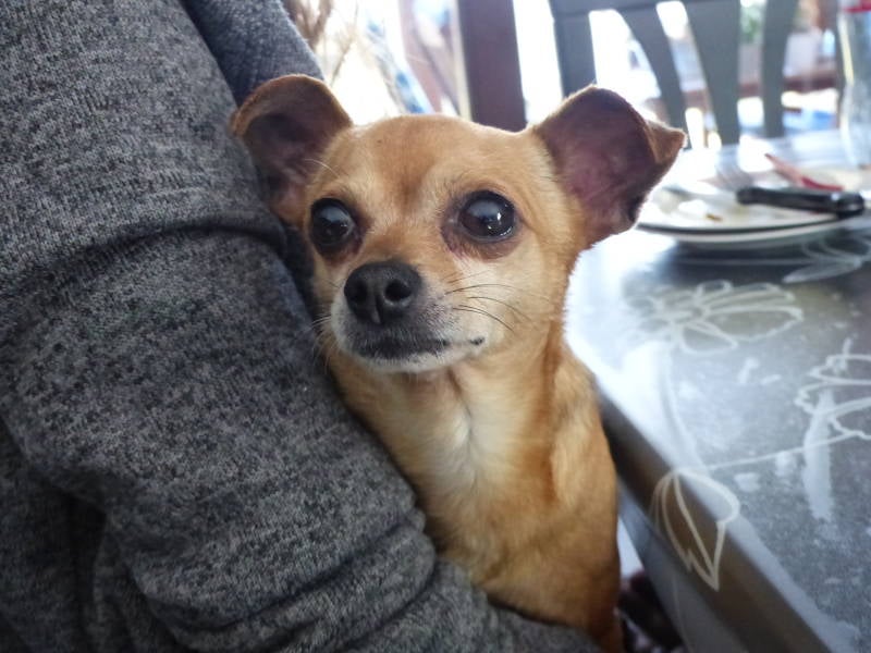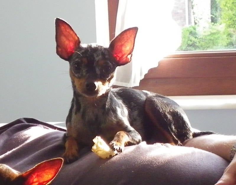 Ik lig graag op de bank samen met mijn baasje en dan ga ik altijd in hun arm liggen zodat die lekker beschermend rond mij liggen. Ik krijg ook speciale kleinere brokken, die worden gemengd onder de andere hu brokken, omdat ik geen grote brokken kan bijten.